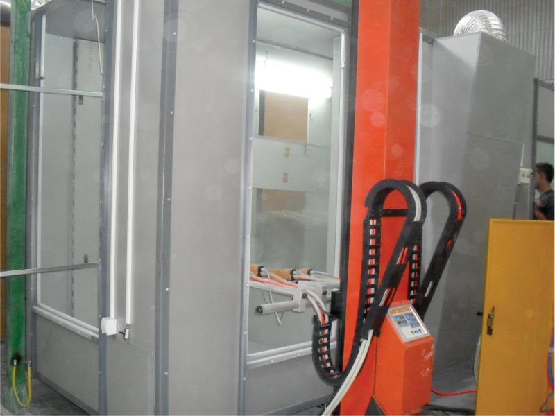 Овој тип на циклон кабини се употребува за фарбање на поголеми серии. Отпрашувањето во овие кабини се решава со два или повеќе циклони, и исто толку филтер единици, така да коефициентот на искористување се движи до 99%. Обично се изработуваат со четири работни места, од кои две работни места се наменети за роботи со соодветен број на пиштоли, и две работни места се наменети за рачно корегирање на нанесениот слој. Конструирани се во комбинација од челични профили инокс елементи и антистатички материјали, кои овозможу- ваат брзо и лесно чистење и спречува лепење на честички прав на внатрешноста на самата кабина.